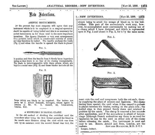 In a brief article in the Lancet, Magennis (1899) described a "surgical clamp" for midwifery pictured here. However, the clamp was only to be used after pulsations of the umbilical cord had ceased. More >> |