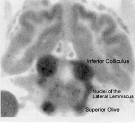 (thus greatest blood flow) in nuclei of the brainstem auditory pathway.