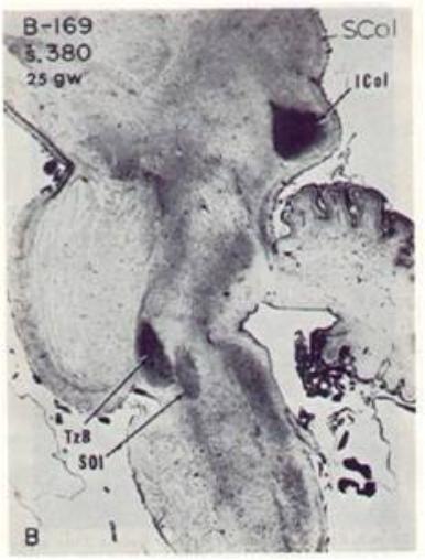 Early myelination of the auditory pathway Myelin formation in brainstem auditory structures of a human fetus at 25 gestational weeks. ICol= inferior colliculus, Sol= superior olive, TzB= trapezoid body. From: Yakovlev PI and Lecours A-R. The myelogenetic cycles of regional maturation of the brain. In A. Minkowski (Ed.), Regional Development of the Brain in Early Life (pp. 3-70). Oxford: Blackwell Scientific Publications, 1967. With permission from Blackwell Scientific Publishers. |